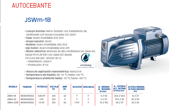 La PEDROLLO JSWm-1B es una electrobomba autocebante , monofásica, especialmente diseñada para el suministro de agua limpia en viviendas, pequeñas instalaciones hidráulicas y sistemas domésticos de presión constante. Su diseño permite una succión eficiente incluso en presencia de aire mezclado con el agua, garantizando un arranque rápido y seguro.
