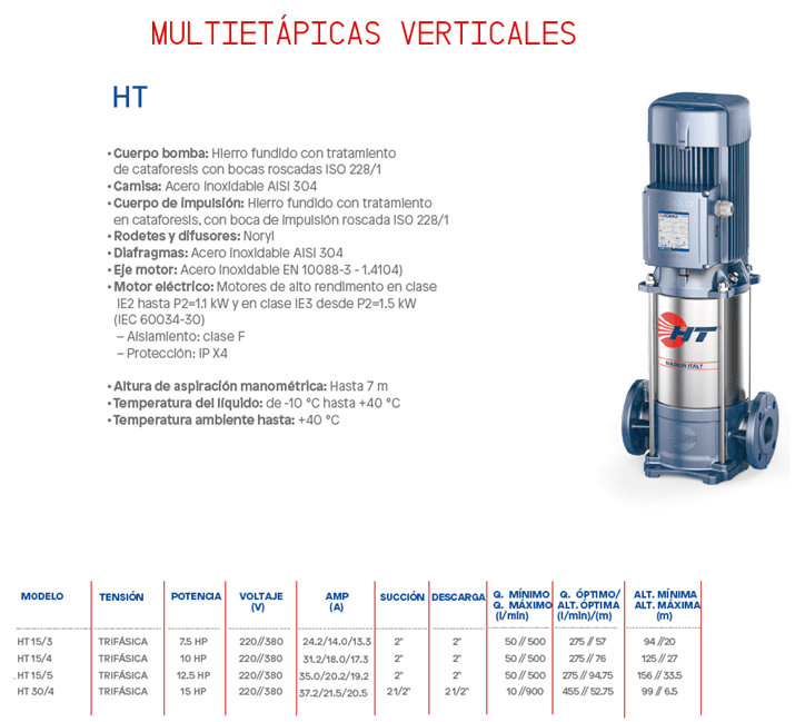 La PEDROLLO HT 15/3 de 7.5 HP es una bomba centrífuga multietápica horizontal, diseñada para aplicaciones que requieren alta presión de agua y caudal constante en sistemas de bombeo. Es ideal para instalaciones industriales, edificios y sistemas de presión constante, ofreciendo eficiencia y operación continua.