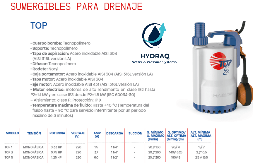 La PEDROLLO TOP 3 de 0.70 HP es una bomba sumergible para agua limpia, diseñada para aplicaciones de drenaje, evacuación de agua y vaciado de cisternas o depósitos. Su diseño compacto y eficiente permite trabajar de forma automática y confiable en entornos domésticos y comerciales.