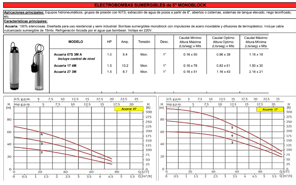 ELECTROBOMBA MULTIETAPAS SUMERGIBLE ESPA ACUARIA 07S 3M A DE 1.5HP MONOFÁSICA DE 1″ Incluye control de nivel