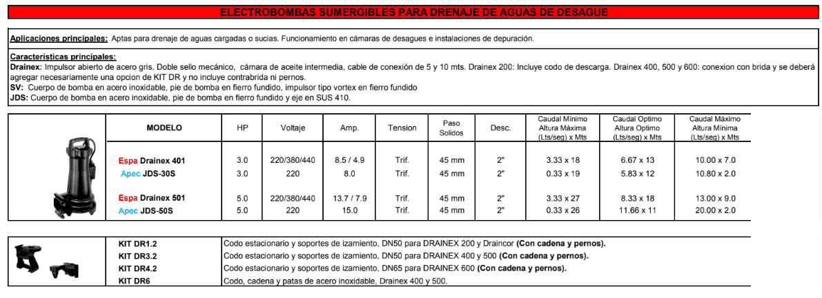 La ELECTROBOMBA SUMERGIBLE ESPA DRAINEX 401 de 3 HP es una bomba centrífuga sumergible para drenaje de aguas residuales, diseñada para el bombeo de líquidos con sólidos en suspensión en aplicaciones exigentes. Su configuración trifásica y construcción robusta la hacen ideal para uso intensivo en sistemas sanitarios, industriales y de evacuación, garantizando alto rendimiento y confiabilidad.