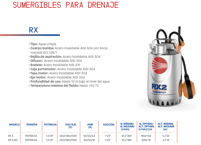 La PEDROLLO RX-5 de 1.5 HP es una bomba sumergible de acero inoxidable para drenaje de agua limpia y ligeramente sucia, diseñada para aplicaciones que requieren evacuación eficiente con mayor resistencia y durabilidad. Su construcción robusta permite trabajar en condiciones exigentes, siendo ideal para uso residencial, comercial e industrial ligero.