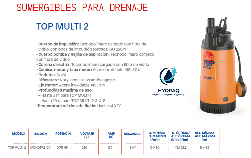 La PEDROLLO TOP MULTI-2 de 0.75 HP es una bomba sumergible para agua limpia, diseñada para aplicaciones que requieren presión constante y funcionamiento eficiente directamente desde cisternas o tanques, piletas, sistemas de recirculación pequeños.