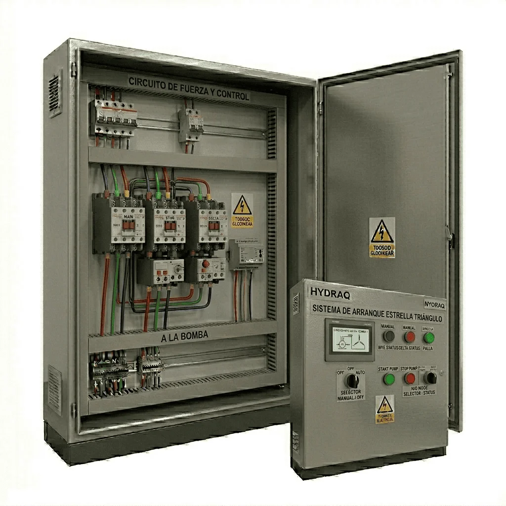 El tablero eléctrico de arranque estrella-triángulo está diseñado para reducir la corriente de arranque en motores eléctricos, evitando sobrecargas en la red y protegiendo el equipo. Es ideal para bombas de mediana y alta potencia.
